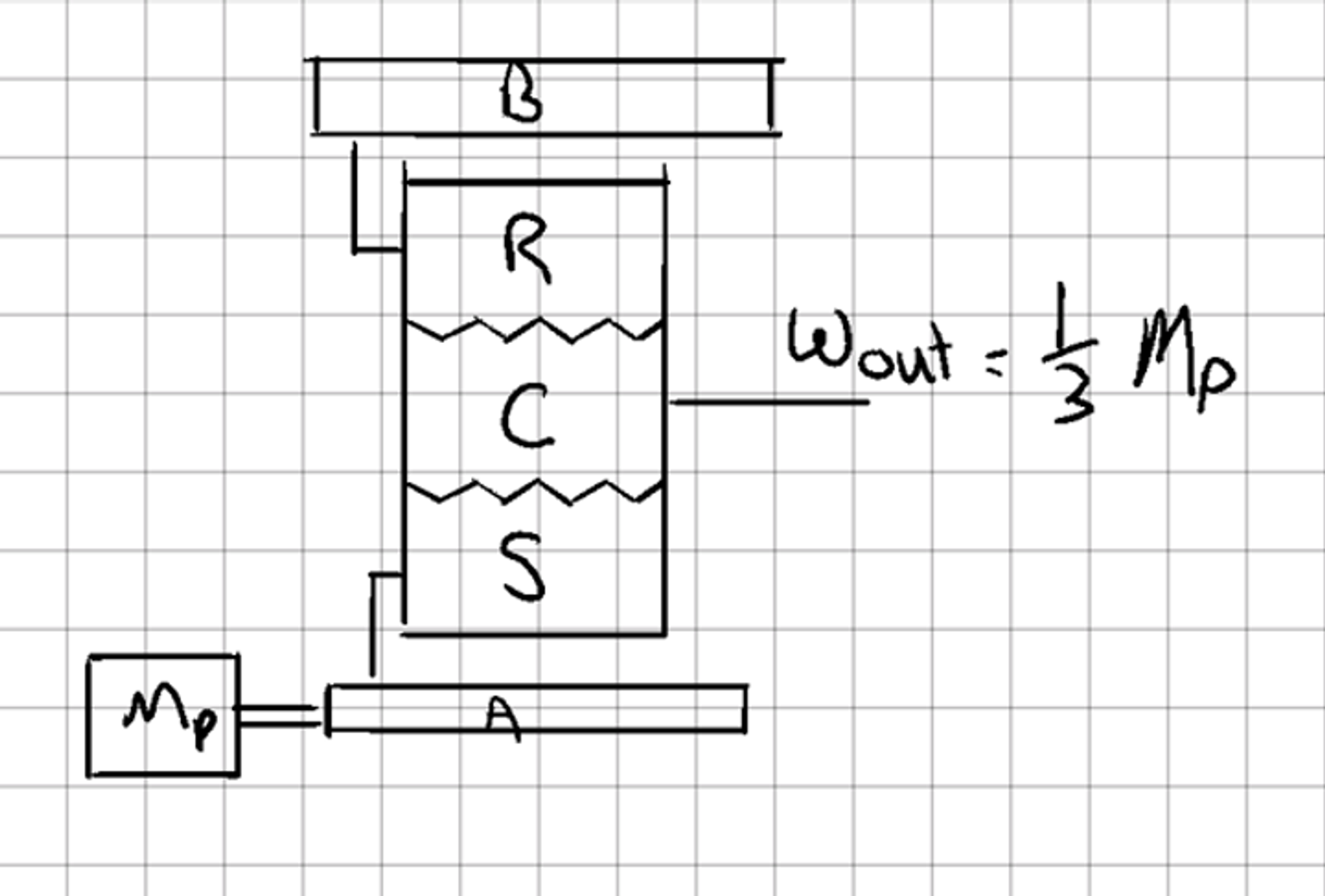 $$ \left\{\begin{matrix} 1w_s+2w_r=3w_c\\ w_s=w_{in}\\ w_r=?\\ w_c=w_{out}\\ \end{matrix}\right.\\ 1w_{in}+2(?) = 3w_{out}\\ w_{out} = (1/3)w_{in} + (2/3)? $$